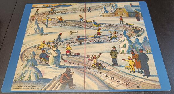 Kelku-mäng (Sledge game) is a roll and move game, where you are sliding down the hill. First player to get down wins the game. On your turn you roll the die, and if you land on the red numbered square, you read what happens. You might get a extra roll, go downward some spaces, go upward some spaces, loose next turn and so on. After all your sliding ends...