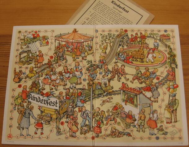 Objective: be the first finisheng the round-trip of an amusement park - moving by turns - simple 'Roll & Move' game each player rolls the die moving forward according number; ending on a marked (red/green/blue) space follow instructions. Target (100) must be reached with a matching number. remarks: game was packed/sent out in a paper bag without die and...