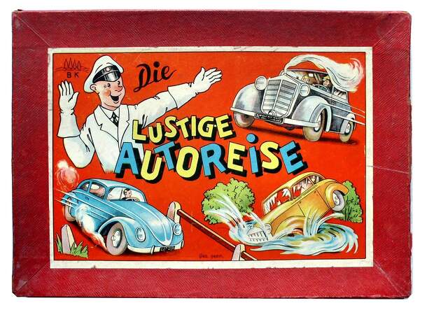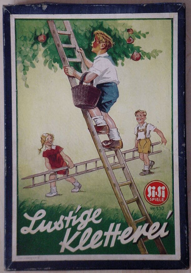 Objective: be the first reaching target space - moving by turns - each player chooses his/her own route (blue/green/red) by turning the spinner (integrated into the board). A '5' let you start. Depending on the space you land on follow instructions (printed next to the space). Black spaces force you to step backwards, target must be reached with a matching...
