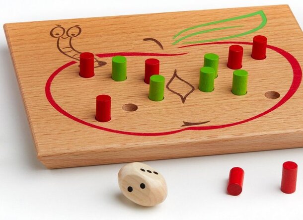 In Raupenrallye, you want to be the first to get your seven caterpillars from one side of the apple to the other. On the apple game board are two lines of holes, with the lines crossing at the core and with each line having three holes on either side of the apple. On a turn, you roll the four-sided die, and (if you don't roll a 4), you move one of your...
