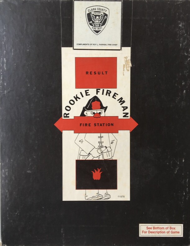 This 1978 educational firefighting game has a playing board, a deck of 34 Fire cards, a deck of 32 Result cards, four Patrol Piece tokens, four badge cards (Chief, Captain, Engineer and Rookie), a D6 with a fire symbol over the 1, and an unpainted lead firetruck. The board has a white track running around the edge, and an inner pattern of six vertical and...