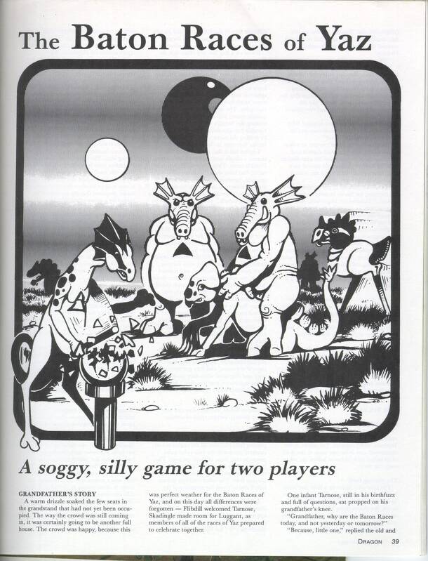 Published in issue #82 of Dragon Magazine, Feb 1984. Republished as part of a boxed set: The Best of Dragon Magazine Games in 1990 The Baton Races of Yaz is played by two teams of Skadingles, Flibdills, Tarnoses and Luggants. The team that breaks all its bulges with its baton in the shortest time is the winner. Each side has 2 batons, 5 Skadingles, 5...