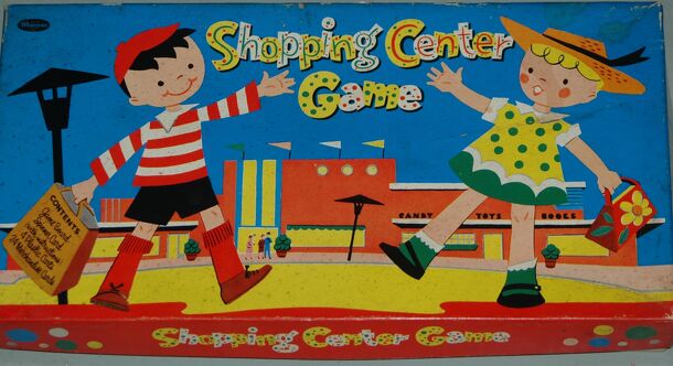 A Baby Boomer children's game celebrating the new-fangled suburban Shopping Center. A spin and move game where you visit different stores and the first player to buy 6 items and get back to the parking lot wins. From the bottom of the spinner The Game of SHOPPING CENTER - for 2,3 or 4 Players OBJECT: To take one purchase card from each store as a player...