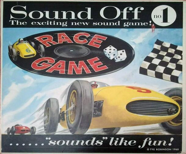A roll-and-move auto racing game with an included 33-1/3 rpm LP which randomizes certain events. From the description on the LP back cover: "Simply place Record on turntable at start of game and keep record spinning all the time -- but keep the volume turned all the way down so that nothing is heard -- until a player stops on a 'SOUND OFF' space. Then turn...