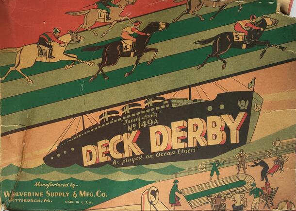 This undated but circa 1920s game is simple dice-driven horse race played on a two-part metal track. Six metal horses and two metal hurdles are also included. The metal seems to be the selling point, since the box declares "As played on Ocean Liners", and both the box and board graphics feature ships and shipboard play of a shuffleboard-sized version of...