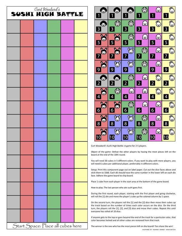 Sushi High Battle is a game about colors, faces, and racing to the top of some ambiguous track of colors. Yes, by battle I mean race! Sushi High Battle consists of 10 custom dice with multiple colors per die. Each is marked with a face that corresponds with a color. Also, each die has a number which indicates the turn in which you may roll it. The game is...