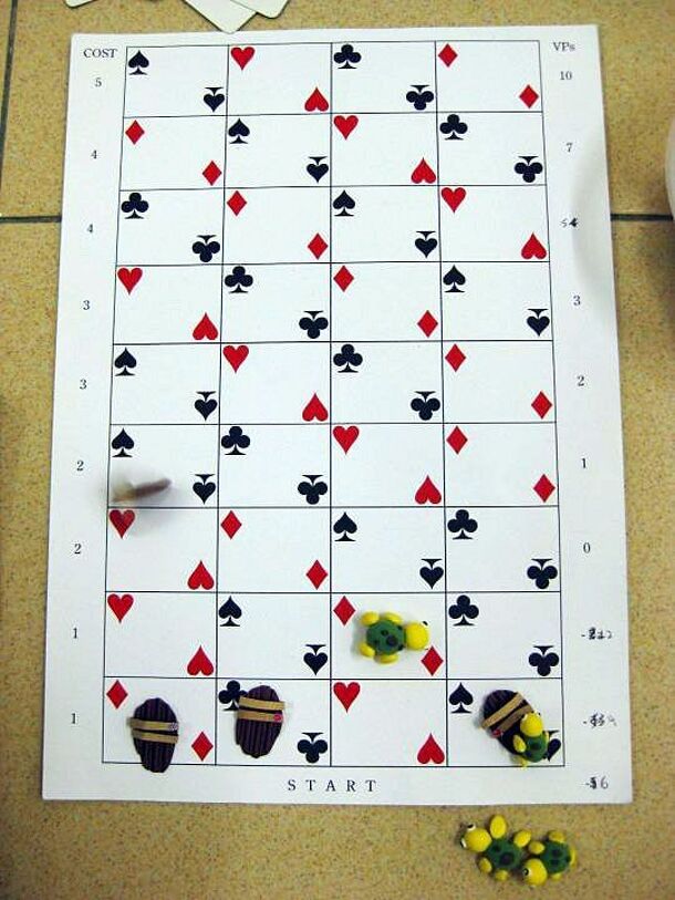 This is a roll and move game across a map of the world divided into a grid 52 spaces wide (E-W) and 33 spaces deep (N-S). There are four start spaces, two on each of the east and west edges, and travellers (wooden triangles) must use a variety of vehicles (wooden cubes and cylinders) to get to the opposite edge of the board and on the other side of the...