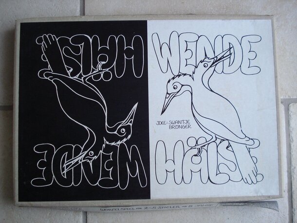 Wendehälse is a dice(s) controlled race game. Each player plays one colour. The wooden pieces have two different-coloured sides. Every time a piece arrives on a field with other pieces, all pieces on this field are turned on the other side. A meeple is also turned if it moves over one of the four cash notes on the way. The game ends when all pieces arrived...