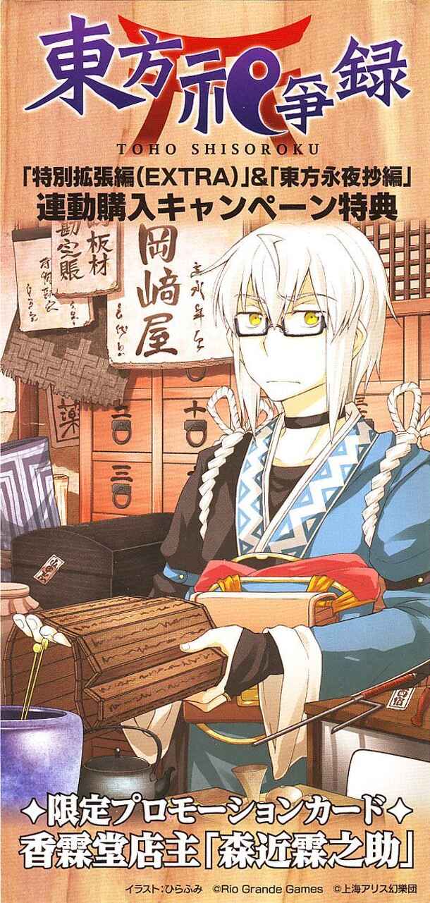 A promo card released for the Shrine Maiden version of Dominion. This promo was sent to people who bought both the Extra arc box and the Imperishable Night box, and contained 10 cards of Rinnosuke and 1 divider (red back). The card's effect is + 1 card +1 action + 1 coin Cost 8* During your buy phase, the price of this card is reduced by 2 (to a minimum of...