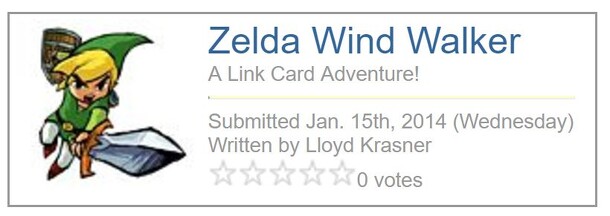 A card game for 2-4+ players based on the Video Game: Zelda the Wind Walker. Players share a common deck. All cards are of 2 basic types: Quest Cards and Hero Cards. There are 7 types of hero cards: Weapons, Items, Defence, Actions, Friends, Special, Tricks. There are 7 types of quest cards: Location, Treasure, Enemy, Boss, Monster, Obstacle, Objectives....