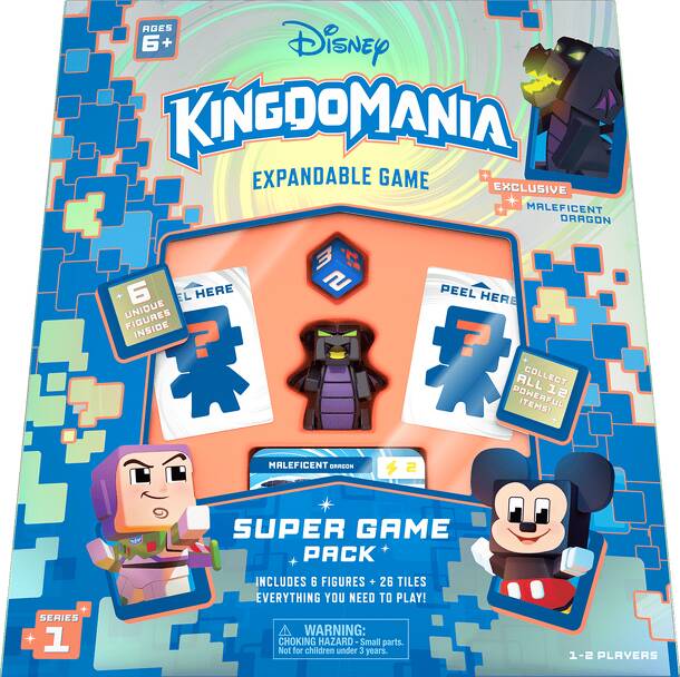Disney Kingdomania takes place inside a make-believe, 8-bit video game that's experiencing glitches that are mixing up the levels. Players must patch the glitches before it's "Game Over" for the characters and their digital game world. Disney Kingdomania: Super Game Pack contains 20 level tiles, a maleficent dragon, three characters from a set of 18...