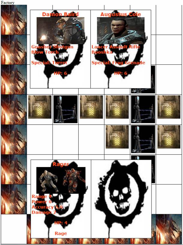 This game is based on the Gears of War: Judgement game mode, Survival, in which players must survive 10 waves of Locusts. Players pick a character; Baird, Paduk, Cole, or Sofia. After picking a map, players must start on the bottom row. On the players turn, they can move, attack, or use their special move. Moving is simply moving one space any cardinal...