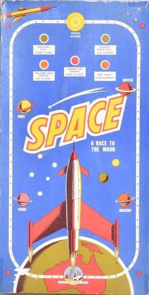A roll and move electronic space race board game starting at the Woomera rocket range in Australia. The first to reach the moon is the winner. Two players each have a wired playing piece (electrode) that they move by the roll of the die. The electrode piece advances along small holes in the board towards the moon passing planets along the way. Each player...