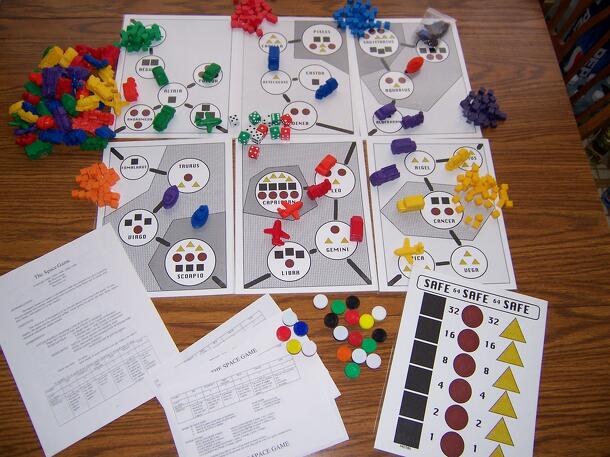 From the box: A team of space explorers are on a common, dangerous mission. You set up the mission. As in real space. each person has an important part to fulfill and must return safely to Earth. Each must use the craft, equipment & fuel wisely. Keep an alert mind on the controls. Lives are at stake. We have to look after one another, performing daring...