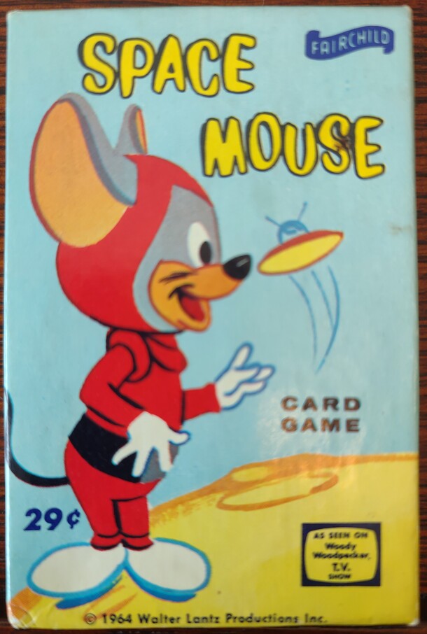A deck of 36 cards (1-9 in four suits) with images of Space Mouse and his associates from Dell/Gold Key Comics. Includes rules for three children's card games: "Pick Up Tricks," "Go Fish," and "The Game of Concentration." Space Mouse was introduced in the theatrical short "The Secret Weapon" (1960) and later appeared on "The Woody Woodpecker Show" (as...