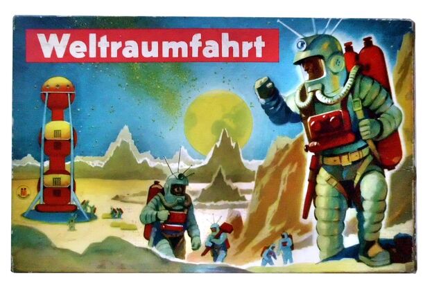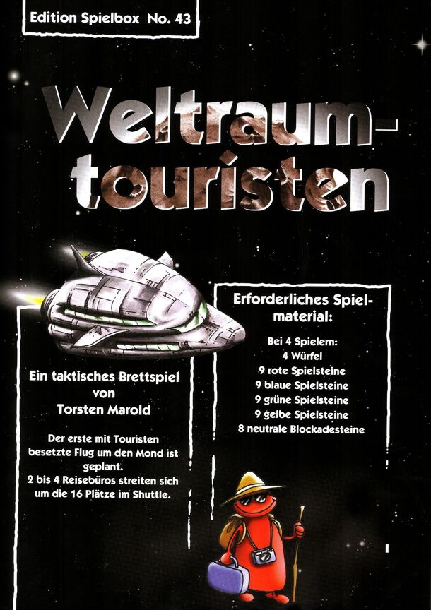 Each player has 4 pawns (cosmonauts). They have to get to a planet and back to earth again. To determine the destination planets, each player draws 4 cards. Then the players turn the spinner. If the spinner shows the angular coordinates of a destination planet, the player places a cosmonaut on the planet. When a player has all 4 cosmonauts on a planet, he...