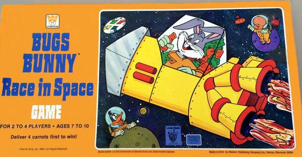Bugs Bunny is an astronaut on a mission to deliver urgently needed carrots to an orbiting space station. The object is to be the first player to deliver four carrots to their matching space station. Players spin and move their pawn from their planet with up to 3 carrots of cargo at a time to the space station with the matching color. Players may move in...