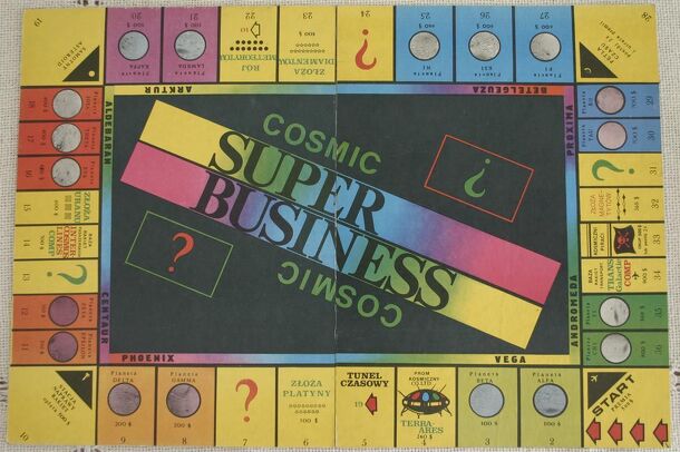 This game published in Poland in the years of economic crisis (last years of real socialism in central-eastern Europe) is clearly a somewhat modified clone of Monopoly. The players buy rights to colonize planets (streets) and build their bases (houses) and planetary colonies (hotels). The differences between this game and Monopoly are: - There are 9 not 10...