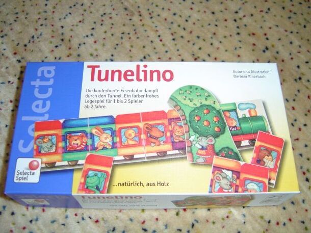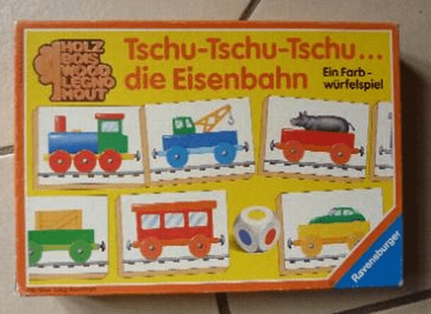 Tschu-tschu-tschu...the railroad is a game with a colour die. It contains 5 wooden tiles depicting locomotives, 15 tiles depicting railroad passenger wagons and 4 smaller tiles depicting conductors. And then there is the 6-sided colour die. From the publishers description on the back side of the game box: Tschu-tschu-tschu... the railroad is a colour die...