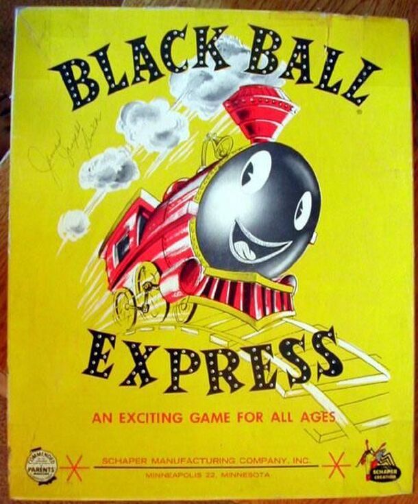 A three dimensional board with grooves for train tracks. The board has an inner and an outer track with spur tracks on the corners for passing other trains. A black die and a white die are rolled and the players moves his trains (marbles) on the outer track and the Black Ball Express on the inner track. When the Black Ball Express lands on a train, that...