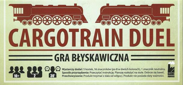 Cargotrain Duel is a promotional board game which serves to promote the full game Cargotrain. The game is just a double sided sheet of paper with instructions on one side and the board on the other. Each player manages a fleet of trains. The goal of the game is to gather most points. On a player's turn she rolls five dice. Then the players takes...