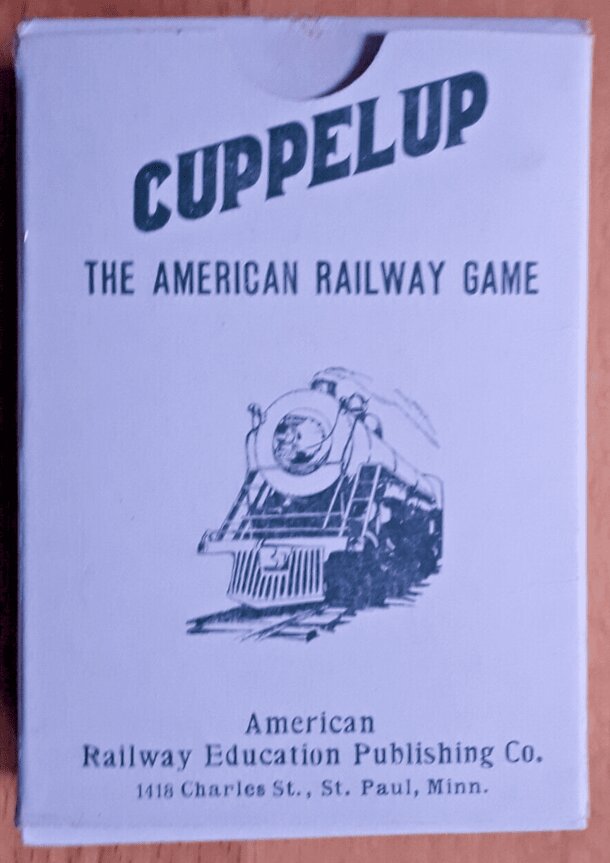 Cuppelup is a card game published in 1925. The game consists of 64 game cards: 8 sets of cards, with 8 cards in each set; each set pertains to a different State. The cards of each set/State are numbered within the set (i.e., ##101-108, 201-208, etc.), and the first card (i.e., #101, #201, etc.) in each set is an engine, followed in order by cars that can...