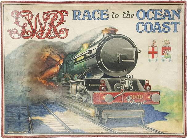 The Great Western Railway company served southwest England. This game is played on a board showing the lines and towns that could be reached by the company. Players refer to a chart to see where your journey would take you. Movement is by a die. You do not need an exact roll to reach your destinations. The first player to reach Penzance, Birkenhead, or...