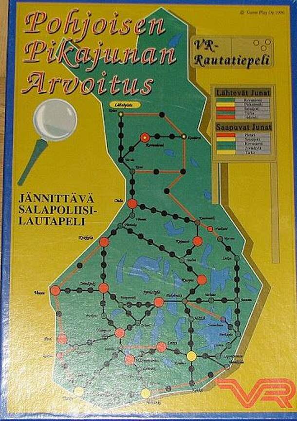The board is map of Finland with not entirely accurate railway and bus network. One of the players is the mystery traveler who plans his/her route from on of three cities in southern Finland (Turku, Helsinki or Kouvola) to one of the three towns in northern Finland (Kolari, Rovaniemi or Keminjärvi) and back. He/she only reveals his/her whereabouts in every...
