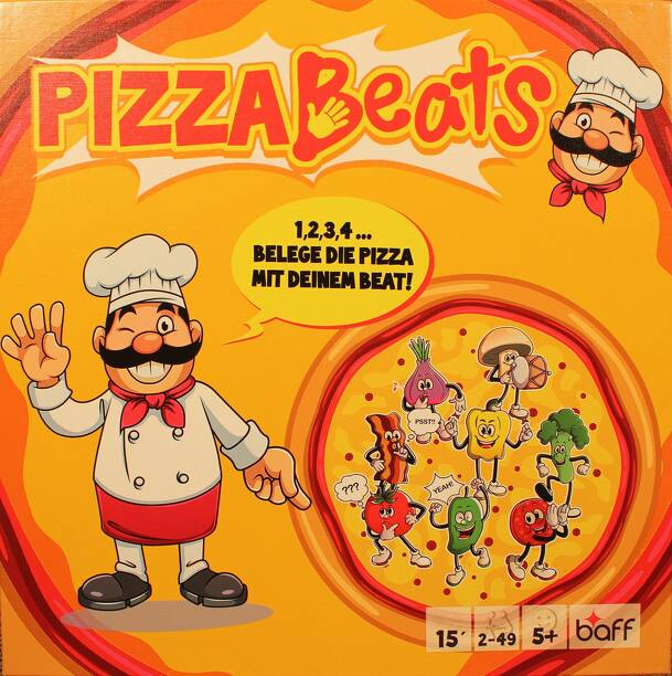 Pizza Beats is a funny body percussion and rythm game for small and big groups. The players can either download the app which plays the beat or say "1, 2, 3, 4" to keep in time. All the pizza quarters are shuffled and 4 are put face up on the table. On each pizza piece, there are symbols which tell the players what they'd need to do. Eg. if there is salami...