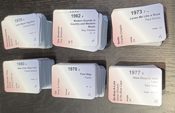 Both sides of the 1024 cards depicts a something important happening in the history of rock music and beyond. Main categories of these facts are dates of LP's and singles, but there is also loads of other things (concerts, movies, beginnings of recording formats and corporations, inventing instruments and so on). Earliest year is 1860 and the last dates...