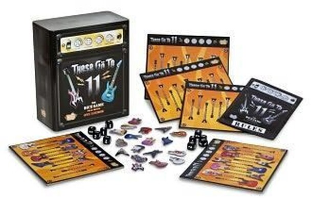 Game box Will you turn it up to 11? Rock the house or get left hanging with this fast-paced dice game! Like Blackjack for rockstars, "These Go To 11" combines luck and a lick of strategy with the goal of building the ultimate guitar collection. Here's what you get: 25 custom dice 5 collection boards 54 awesome guitars User summary These Gö To 11 is played...
