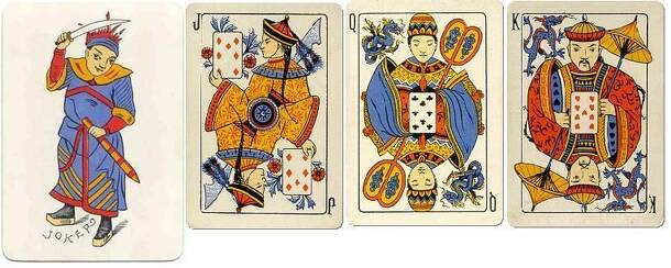 In 1891 Wilkinson induced the card maker Charles Goodall to issue a special pack of cards with accompanying booklet of rules to play Khanhoo. The deck contained two sets each of Ace through Nine of Hearts, Clubs and Diamonds, with two specially-designed Jacks, Queens and Kings standing in for the "extra cards".