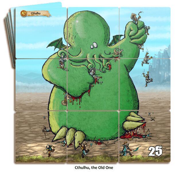 Cthulhu rises in the world of Kharnage! You have no more choice to be more powerful than him by destroying more units or by banishing him! Cthulhu is an expansion for Kharnage, drawn by Goomi. —description from the publisher Game changes: SET UP Set a Horror pile with 3 Cultists cards, 1 card from the Shoggoth and 1 card from Cthulhu (except the head)....