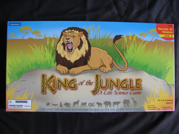 King of the Jungle is an educational game designed to test and improve students' knowledge of life science. Players move pawns along a track. In order to move, a player must draw a card and answer the question on the card correctly. He or she may then roll the die and move along the track. Along the track, spaces may take away or grant extra turns, send the player back or forward along the track or allow the player to trade places with another. If a player lands on another player's space, the first player there must move back along the track to the closest space marked with an animals. The first player to reach the end of the track wins.