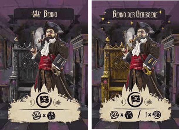 Double-sided promo card, included with Pirate Tales. Front: "Benno" Power: D6×D12 Speed: 4 Special Ability: "Pirate Flag" - After losing a battle against "Benno", the losing player must return one of their items of their choice (other than a potion) to the forge. Back: "Benno der Gerissene" Power: D6×D12, 1×re-roll Speed: 4 Special Ability: "Pirate Flag" -...