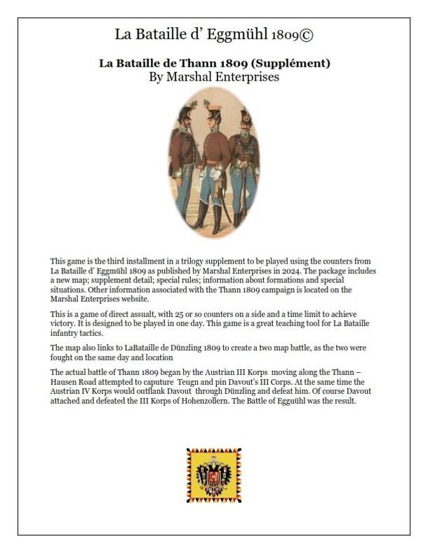 This game is the third installment in a trilogy supplement to be played using the counters from La Bataille d’Eggmühl 1809 as published by Marshal Enterprises in 2024. The package includes: A new map, supplemental 28-page special rules information about formations and special situations Other information associated with the Thann 1809 campaign is located...