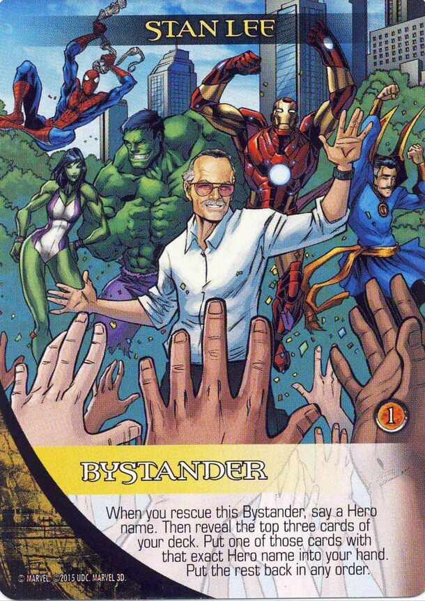In 2015, packs of Marvel 3D trading cards contained playable cards for Legendary. All but one card, a Stan Lee Bystander, were reprinted in the 2019 expansion Dimensions. This makes Stan Lee the only gameplay unique card from Marvel 3D that cannot be obtained in another printing of the game. A Bystander promo card featuring Stan Lee and the rules text:...