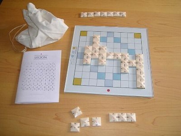 Legion is a new skill and strategy game. It has 81 unique playing tiles and is played on a 9x9 board with 81 squares. each playing tile is square, and has either two, one or no stripes marked on each side.