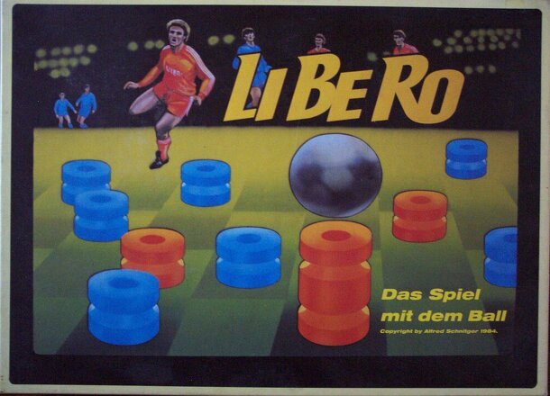 Abstract Soccer Game played on a grid of squares. Each player has eleven wooden tokens - nine basic ones, one libero (sweeper) and one goalkeeper. Each piece has a small dent on top so the ball can be placed on it.