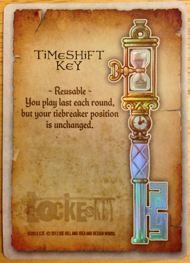 Foil promo card for Locke & Key card game. During the game you can play last each round, but your tiebreaker position is unchanged. The Timeshift Key Promo card is added to the...