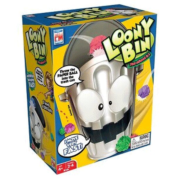 A mechanical trash bin moves quickly around the room, changing directions, opening and closing its lid, players try to throw their paper balls into the bin. Each player has their own colored paper to make it easy to keep score. The first player to toss all of their paper balls into the Loony Bin is the Winner!