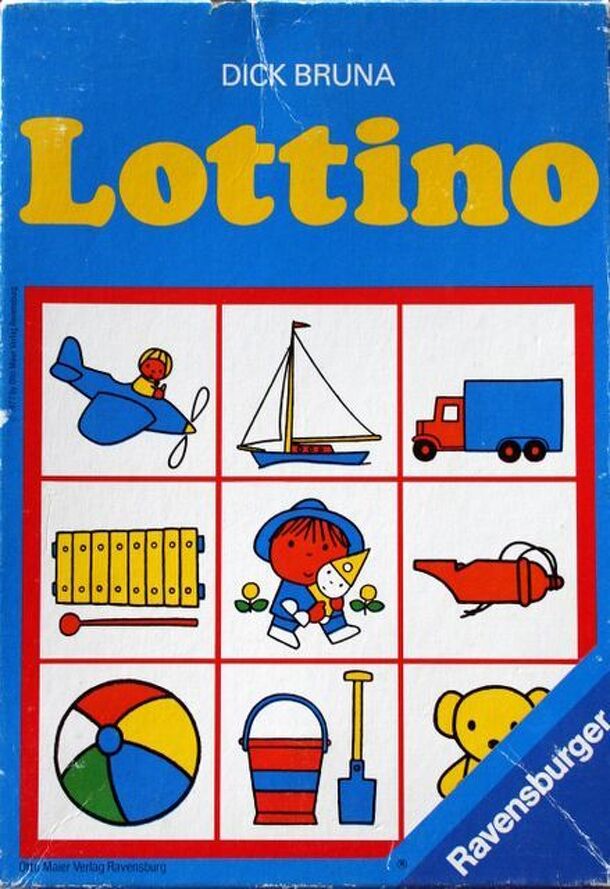A lotto game for children with 3x3 cards depicting pictures on one side or mere silhouettes on the other and the cards to match those pictures.