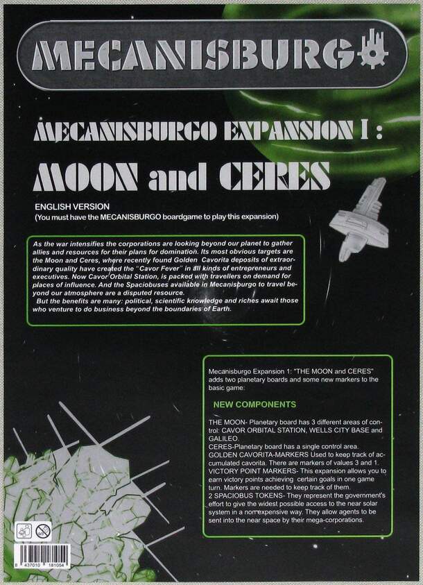 A Mecanisburgo Expansion 1: Moon and Ceres egy könnyen tanulható kiegészítő a Mecanisburgo társasjátékhoz, 2 - 6 játékos részére, az átlagos játékidő hosszabb, akár 2 óra is lehet. A társast, a könnyebb tanulhatósága ellenére, csak 14 éves kortól ajánljuk kipróbálni. A játékmenet erősen épít a visszatartott információ, a kártya húzás és a terület...