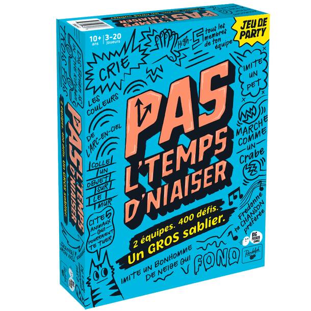 Two teams, 400 challenges, 20 seconds, no time to fool around! In Pas l'temps d'niaiser, two teams go head-to-head in a series of ridiculous challenges. Turn the audible hourglass and complete the task on the map before the hourglass runs out. Flip it over immediately and the other team is on the grill! Every second counts, because as soon as the hourglass...