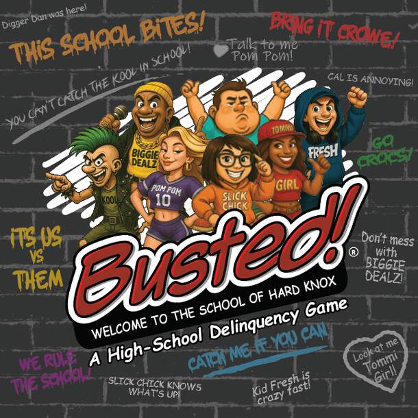 Busted! is a satirical high-school board game set inside the crowded halls, classrooms, restrooms, and stairwells of Hard Knox High. One player may take on the role of the Faculty, while the remaining players are Students trying to survive the school day by breaking rules, looting lockers, and collecting Friends—without getting Busted! or sent to BIG...
