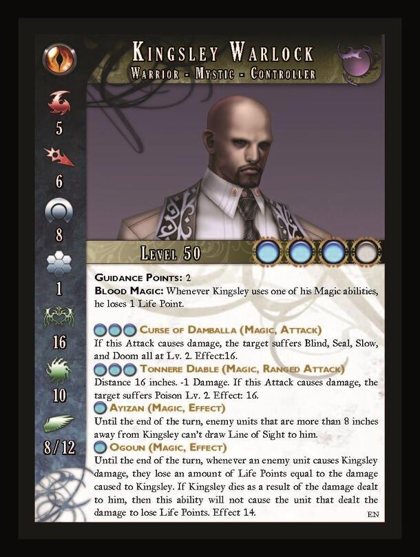 Kingsley Warlock is one of the CEOs of Black Sun, as well as one of the most trusted agents of the Delacroix family. Master of both the sword and the darkest arts, he uses his control over the undead to greatly increase Black Sun’s, as well as his own, influence. Dark Black Sun Warrior Mystic Controller - Lv. 50 At 5 | Dm 6 | Df 8 | Ar 1 | LP 16 | Re 10 |...