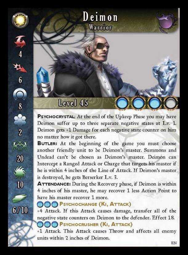 Deimon is the head butler and guardian of the Steiner family, a man of inflexible will and indomitable skill. Light Black Sun Warrior - Lv. 45 At 4 | Dm 6 | Df 8 | Ar 2 | LP 20 | Re 10 | Mo 6/10 | AP 3/4 Psychocrystal: At the end of the Upkeep Phase you may have Deimon suffer up to three separate negative states at Lv. 1. Deimon gets +1 Damage for each...