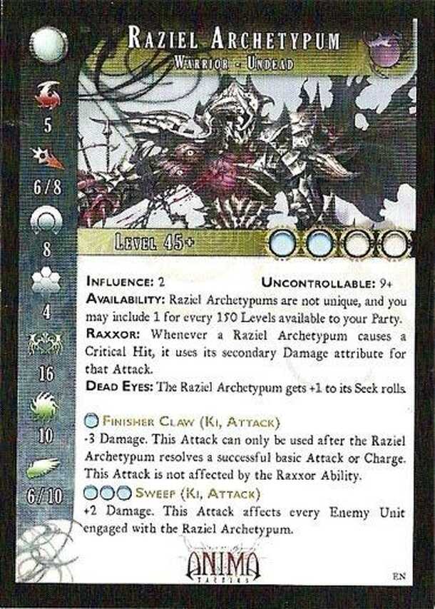 The ultimate necromatic weapons, Raziel are terrifying undead knights created by combining Black sun's scientific research with the power of the Book of the Dead. Each a masterpiece of death and destruction, just one can lay waste to whole armies with its fell blades. Neutral Black Sun Warrior Undead - Lv. 45+ At 5 | Dm 6 (8) | Df 8 | Ar 4 | LP: 16| Re 10...