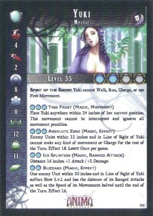 Yuki's most striking feature is her icy beauty. One of the last Ice Maidens of Varje, she has been assigned to observe humanity in the name of the fallen angels of Samael. Her powerful elemental powers should help keep her safe during her sojourn. Neutral Samael Mystic - Lv. 35 At 4 | Dm 2 | Df 8 | Ar 0 | LP: 12 | Re 11 | Mo / | AP 2/4 Spirit of the Snow:...