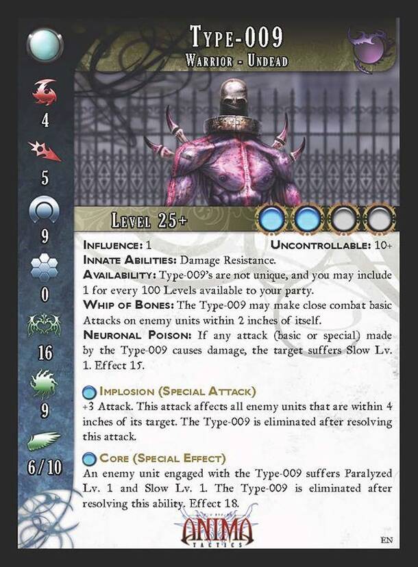 Publisher Blurb: The Type-009 is Black Sun's latest evolution of elite unstoppable necromantic weapons. They have no qualms with destroying themselves to destroy their designated target. Neutral Black Sun Warrior Undead — Lv. 25+ Whip of Bones: The Type-009 may make close combat basic Attacks on enemy units within 2 inches of itself. Neuronal Poison: If...